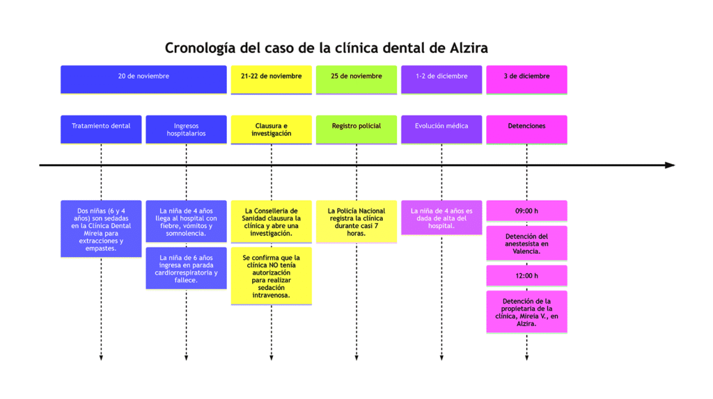 Las acusaciones se derivan de graves irregularidades. La Conselleria de Sanidad confirmó que la clínica solo tenía autorización para realizar odontología general y administrar anestésicos locales, careciendo por completo de permiso para realizar sedación intravenosa, técnica que se empleó con las menores.